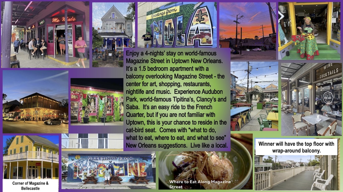 New Orleans Trip: Enjoy 4-nights stay on world famous Magazine Street in Uptown New Orleans in a 1.5 bedroom apartment with a balcony overlooking Magazine Street, the center for art, shopping, restaurants, nightlife and music. Experience Audubon Park, world famous Tipitina’s, Clancy’s and Saba. Easy ride to the French Quarter, but if you are not familiar with Uptown, this is your chance to reside in the cat-bird seat. Comes with a what to do, what to eat, where to eat, and what to see New Orleans suggestions. Live like a local.